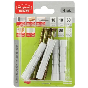 Kołek uniwersalny 10 x 80 mm 4 szt. Wkręt-met pozwala na pewne mocowanie różnego rodzaju elementów, zarówno dekoracyjnych, wykończeniowych jak i konstrukcyjnych. Stosowanie jest banalnie proste - wystarczy umieścić kołek w przygotowanym wcześniej otworze montażowym a następnie wkręcić dołączony łącznik (wkręt lub śruba). Poprawne i trwałe mocowanie jest możliwe tylko przy odpowiednim doborze produktu i wykonaniu otworów montażowych zgodnie ze wskazaniami na opakowaniu (średnica i głębokość otworu, grubość mocowanego elementu, rodzaj podłoża, przewidywane obciążenie).