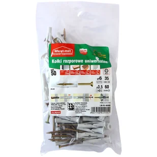 Kołek uniwersalny 6 x 60 mm 50 szt. Wkręt-met pozwala na pewne mocowanie różnego rodzaju elementów, zarówno dekoracyjnych, wykończeniowych jak i konstrukcyjnych. Stosowanie jest banalnie proste - wystarczy umieścić kołek w przygotowanym wcześniej otworze montażowym a następnie wkręcić dołączony łącznik (wkręt lub śruba). Poprawne i trwałe mocowanie jest możliwe tylko przy odpowiednim doborze produktu i wykonaniu otworów montażowych zgodnie ze wskazaniami na opakowaniu (średnica i głębokość otworu, grubość mocowanego elementu, rodzaj podłoża, przewidywane obciążenie).