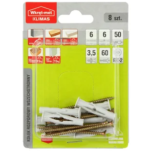 Kołek uniwersalny 6 x 60 mm 8 szt. Wkręt-met pozwala na pewne mocowanie różnego rodzaju elementów, zarówno dekoracyjnych, wykończeniowych jak i konstrukcyjnych. Stosowanie jest banalnie proste - wystarczy umieścić kołek w przygotowanym wcześniej otworze montażowym a następnie wkręcić dołączony łącznik (wkręt lub śruba). Poprawne i trwałe mocowanie jest możliwe tylko przy odpowiednim doborze produktu i wykonaniu otworów montażowych zgodnie ze wskazaniami na opakowaniu (średnica i głębokość otworu, grubość mocowanego elementu, rodzaj podłoża, przewidywane obciążenie).