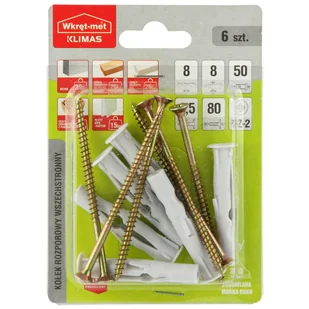 Kołek uniwersalny 8 x 80 mm 6 szt. Wkręt-met pozwala na pewne mocowanie różnego rodzaju elementów, zarówno dekoracyjnych, wykończeniowych jak i konstrukcyjnych. Stosowanie jest banalnie proste - wystarczy umieścić kołek w przygotowanym wcześniej otworze montażowym a następnie wkręcić dołączony łącznik (wkręt lub śruba). Poprawne i trwałe mocowanie jest możliwe tylko przy odpowiednim doborze produktu i wykonaniu otworów montażowych zgodnie ze wskazaniami na opakowaniu (średnica i głębokość otworu, grubość mocowanego elementu, rodzaj podłoża, przewidywane obciążenie).