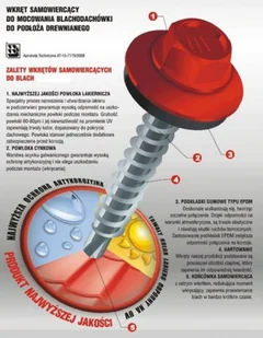 Prawidłowe dociśnięcie podkładki (mocowanie blach)Nowa jakość powłoki lakierniczejWkręty samowiercące do mocowania blach profilowanych, pokryte są specjalną powłoką lakierniczą. Nowoczesny sposób jej nakładania, sprawia, że jest niezwykle trwała i odporna na uszkodzenia mechaniczne, co jest szczególnie ważne przy montażu, a wkręty spełniają swoją rolę przez bardzo wiele lat. Odporność na promieniowanie UV gwarantuje również niezmienność koloru. Do lakierowania wkrętów firma Wkręt-met stosuje, tylko wysokiej jakości, sprawdzone komponenty.