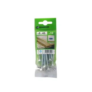Wkręt 5 x 45 mm 12 szt. Standers to uniwersalny łącznik pozwalający na pracę w różnych materiałach jak drewno, tworzywa sztuczne, płyty meblowe i budowlane, a także montaż okuć i akcesoriów meblowych oraz innych elementów konstrukcyjnych. Do poprawnego działania łącznika niezbędne jest odpowiednie narzędzie (wkrętak płaski, krzyżakowy PH, PZ lub Torx). Rodzaj i rozmiar narzędzia wskazano na opakowaniu.