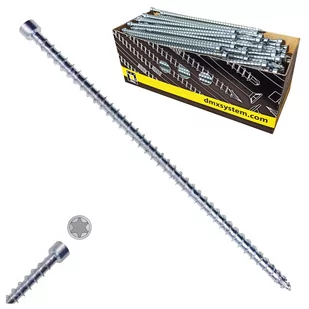 Doskonałe w budownictwie drewnianym i stolarstwie, w konstrukcjach szkieletowych, konstrukcjach hal, renowacji stropów z belek drewnianych. CECHY pełny gwint - optymalnie przenosi obciążenia między łączonymi elementami (zarówno w przypadku sił ściskających jak i rozciągających); wkręty z pełnym gwintem w przeciwieństwie do wkrętów z gwintem częściowym wykazują ograniczone przemieszczanie, wysoką sztywność i zmniejszoną plastyczność; wąski łeb walcowy zmniejsza ryzyko powstawania pęknięć, również w przypadku mocowania blisko krawędzi; uniwersalne w zastosowaniu zarówno w przemyśle, jak i rzemiośle; ATUTY Wkręty DMX® posiadają głębokie gniazdo TX pozwalające na pewne przeniesienie momentu obrotowego. W ofercie znajdują się dwa rodzaje wkrętów z pełnym gwintem – z łbem stożkowym oraz z łbem walcowym, w ponad 30 różnych rozmiarach. Wkręty z pełnym gwintem DMX ® rozszerzają dotychczasową ofertę wkrętów, a także w zależności od preferencji mogą stanowić ciekawą alternatywę dla tradycyjnych łączników do drewna. Wkręty z pełnym gwintem w przeciwieństwie do wkrętów z gwintem częściowym wykazują:
