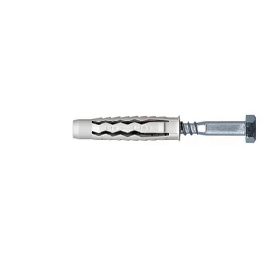 Dybel uniwersalny z kołnierzem , rozpiera w czterech kierunkach , koszulka wykonana w 100% z nylonu , wkręt z łbem sześciokątnym .
