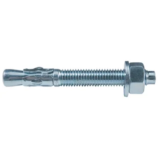 Kotwa stalowa dwurozporowa z łbem 6-kątnym 10x130mm, firmy Fischer. Pierścieniowe śruby rozporowe przeznaczone są do zamocowań statycznie obciążonych budowlanych elementów konstrukcyjnych w podłożu z betonu zwykłego, klasy nie niższej niż C20/2. CECHY I KORZYŚCI Szeroka gama rozmiarów do zastosowania przy średnich i dużych obciążeniach Zmontowana razem z podkładką i nakrętką Ochrona gwintu przed uszkodzeniem SPOSÓB MONTAŻU Nawiercić otwór Umieścić łącznik w otworze - przed instalacją umieścić nakrętkę w odpowiedniej pozycji (czop szworznia powinien wystawać 3mm ponad nakrętkę) Dokręcić nakrętkę (podczas dokręcania śruba naciska na klips rozporowy, co powoduje jego docisk do ścianek wywierconego otworu) PRZYKŁAD ZASTOSOWANIA Montaż łączników, kątowników, wieszaków belek do elementów betonowych Mocowanie drewnianych belek do ściany Mocowanie podstaw słupa do podłoża betonowego.