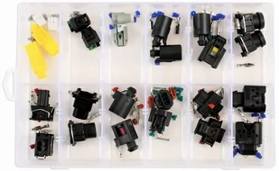 Zestaw złączy elektrycznych BMW / Mercedes 24 szt Popularny asortyment złączy elektrycznych pasujących do BMW i Mercedes Benz. Zestaw zawiera 2 sztuki każdego - 9 typów 2 pinowych złączy i 3 rodzaje 3 pinowych złączy. Konektory można stosować w dowolnym miejscu pojazdu, głównie w komorze silnika w celu ochrony obwodów i ważnych czujników układu sterowania silnikiem. Zestaw zawiera: 2szt. 2 pinowe czujniki temperatury powietrza, 2szt.