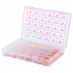 Zestaw miedzianych pierścieni uszczelniających marki KS Tools składa się z 300 sztuk o różnych rozmiarach. Podkładki te nadają się szczególnie do stosowania z korkami spustowymi oleju, śrubami banjo, a także do wielu innych zastosowań. Co więcej zestaw miedzianych podkładek jest starannie zorganizowany w wygodnej walizce z tworzywa sztucznego. Materiał: miedź Zgodnie z DIN 93 Produkt dostarczany w plastikowym etui 300-częściowy zestaw miedzianych pierścieni uszczelniających: 10 x 5 x 9,0 x 1,0 mm 10 x 6 x 10,0 x 1,0 mm 10 x 6 x 12,0 x 1,0 mm 10 x 8 x 12,0 x 1,0 mm 10 x 8 x 14,0 x 1,0 mm 10 x 8 x 14,0 x 1,5 mm 10 x 9 x 14,0 x 1,0 mm 10 x 10 x 14,0 x 1,0 mm 10 x 10 x 14,0 x 1,5 mm 10 x 10 x 16,0 x 1,0 mm 10 x 12 x 16,0 x 1,0 mm 10 x 12 x 16,0 x 1,5 mm 10 x 12 x 18,0 x 1,5 mm 10 x 13 x 18,0 x 1,0 mm 10 x 14 x 18,0 x 1,5 mm 10 x 14 x 20,0 x 1,5 mm 10 x 14 x 20,0 x 2,0 mm 10 x 16 x 20,0 x 1,5 mm 10 x 16 x 22,0 x 1,5 mm 10 x 18 x 22,0 x 1,5 mm 10 x 18 x 24,0 x 1,5 mm 10 x 15,0 x 20 x 2,0 mm 10 x 20 x 24,5 x 1,5 mm 10 x 20 x 24,5 x 0,8 mm 10 x 22 x 27,0 x 1,0 mm 10 x 22 x 29,0 x 1,5 mm 10 x 24 x 29,0 x 1,5 mm 10 x 24 x 32,0 x 2,0 mm 10 x 26 x 34,0 x 2,0 mm 10 x 28 x 36,0 x 2,0 mm