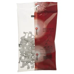 Uchwyt z gwoździem hartowanym do natynkowego montażu przewodów płaskich o maks. wymiarach 5,5x10 mm. Wykonany z tworzywa sztucznego. Wytrzymałość terminczna od -8 st.C do +85 st.C. Pakowany po 50 szt.