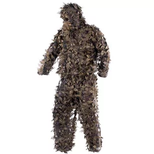 Strój maskujący składający się z 3 elementów: kurtki, spodni i nakrycia głowy. Wykonany z przewiewnego poliestru. Strój przeznaczony do noszenia na ubranie. Materiał, z którego został wykonany, cechuje się odpornością na prztarcia.