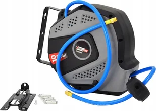 Wąż wykonany z elastycznego PCV, wzmocniony siatką poliestrową. UUmieszczony w zamkniętej obudowie z tworzywa sztucznego. Wyposażony w automatyczny mechanizm zwijania, plastikowy stoper zapobiegający zwinięciu się węża. Mechanizm zapadkowy blokuje wąż w żądanej pozycji po jego lekkim szarpnięciu w trakcie rozwijania. Składana rączka ułatwia transport. Plastikowy uchwyt wraz z akcesoriami pozwala na przykręcenie do ściany czy sufitu. Umożliwia łatwe doprowadzenie sprężonego powietrza w dowolne miejsce w strefie zasięgu węża. Sprawdzi się w warsztacie i przydomowym garażu, gdzie do pracy wykorzystuje się narzędzia i urządzenia pneumatyczne.