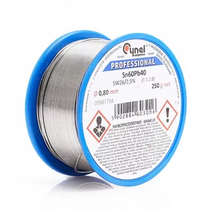 Cyna lutownicza z topnikiem Sn60Pb40 0,80mm 250g Cynel Stop S-Sn60Pb40 wyprodukowany w pierwszym wytopie cyny i ołowiu, w ciągłym procesie odlewania bez dostępu powietrza, następnie wyciskany, co zapewnia eliminację występowania tlenków. Zastosowanie: Spoiwo lutownicze S-Sn60Pb40 ma zastosowanie głównie w przemyśle elektronicznym, do produkcji standardowych urządzeń i podzespołów elektronicznych, elektrotechnice oraz do lutowania elementów z pokryciami cynowymi, cynowo-ołowiowymi, kadmowymi, cynkowymi i srebrnymi. Specyfikacja: Grubość: 0,80 mm Skład chemiczny: