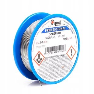 Cyna lutownicza z topnikiem Sn60Pb40 1,00mm 100g Cynel Stop S-Sn60Pb40 wyprodukowany w pierwszym wytopie cyny i ołowiu, w ciągłym procesie odlewania bez dostępu powietrza, następnie wyciskany, co zapewnia eliminację występowania tlenków. Zastosowanie: Spoiwo lutownicze S-Sn60Pb40 ma zastosowanie głównie w przemyśle elektronicznym, do produkcji standardowych urządzeń i podzespołów elektronicznych, elektrotechnice oraz do lutowania elementów z pokryciami cynowymi, cynowo-ołowiowymi, kadmowymi, cynkowymi i srebrnymi. Specyfikacja: Grubość: 1,00 mm Skład chemiczny: