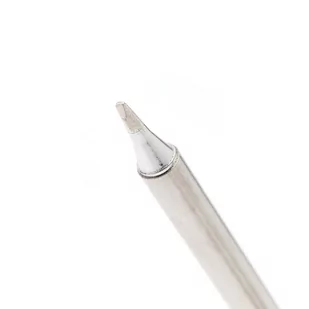 Grot lutowniczy T12-D12 dłuto 1,2mm Dane techniczne: grot T12-D12 końcówka lutownicza grota typu dłuto końcówka 1,2mm grot zintegrowany z grzałką 75W 24V polecany do precyzyjnego lutowania małych elementów elektronicznych, oraz SMD przeznaczony do kolb stacji lutowniczych: Hakko FX-951, FX-950, FM-203, FM-204, FM-206, Bakon 950D, Aoyue 2702, Jovy, GM-951, oraz innych obsługujących groty T12 Jak widać na rysunku obok, groty z serii T-12 są zintegrowane z grzałką i czujnikiem temperatury. Tak więc element grzewczy i końcówka lutownicza to jeden element nazywany grotem. Proszę zwrócić uwagę że czujnik temperatury (termopara) jest umieszczony bardzo blisko końcówki lutowniczej grota, co zapewnia bardzo dokładny pomiar temperatury w trakcie procesu lutowania.