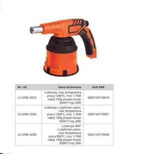 Lutlampa 360° z zapłonem piezo, max temperatura pracy 850°C, moc 1,7kW nabój 190g propan-butan (EN417-typ 200)