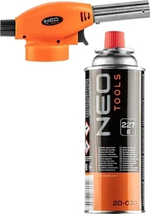 Palnik gazowy nakręcany + nabój z gazem butan, 227 g, 20-041 marki NEO to zestaw praktycznego palnika oraz pojedynczego naboju w typie EN 417 o pojemności 227 g. Urządzenie osiąga temperaturę pracy 1300°C oraz moc 1,11 kW. Palnikiem można realizować zadania w pozycji pionowej (+/- 80 stopni). Wyposażony został w praktyczny zapłon piezo, pozwalający na szybkie odpalenie lampy. Nabój cechuje się uniwersalnym zastosowaniem np.