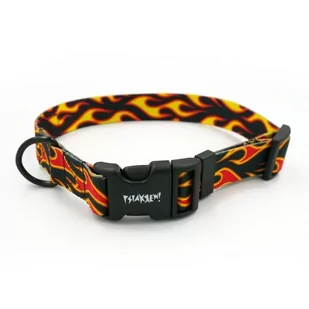 Obroża dla Psa Model Dog On Fire, szerokość 2,5 cm Płomienie piekielne, klasyczny wzór dla rockersów i easy riderów, klimaty rock and rollowe, tatuaże, życie nocne itp. itd Wszystko dla Twojego odjechanego Psa! Autorski projekt Psiakrew. Designerska obroża z kolorowej taśmy; zapinana na wyprofilowany do kształtu szyi psa zatrzask, klamerkę DURAFLEX ® Wykonana z gładkiej i mocnej taśmy, niepochłaniającej wody, w odróżnieniu od innych propozycji na rynku, obszytych bawełnianym materiałem. Obroża z regulacją rozmiaru do obwodu szyi psa, spawane półkółeczko do przypinania smyczy. Łatwa w utrzymaniu czystości.
