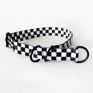 Obroża pół zaciskowa dla Psa Model Checker, szerokość 2,5 cm Szach i Mat, a potem na spacer. Klasyczny wzór w czarno-białą szachownicę. Autorski projekt Psiakrew. Designerska półzaciskowa, regulowana obroża z kolorowej taśmy zakładana przez głowę. Po założeniu, przypięciu smyczy i lekkim pociągnięciu obroża dopasowuje się do obwodu szyi psa.