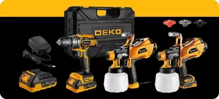 1. 9 kg Opakowanie: kartonowe Wyposażenie: akumulator 2 Ah, ładowarka, lejek do pomiaru lepkości, zbiornik na farbę,klucz płaski, igła do czyszczenia dysz,3 dysze natryskowe z rurkami (1.0/1.8/2.5 mm),lejki papierowe, rękawiczki lateksowe, pasek na ramię,instrukcja obsługi Pistolet DEKO DKSG20K3Y typu HVLP działa na zasadzie rozpylania w chmurze powietrza znajdującej się w zbiorniku farby lub innej cieczy. Skrót HVLP oznacza High Volume Low Presure (dużą objętość i niskie ciśnienie). Sprężone powietrze, które dostarcza do pistoletu kompresor jest kierowane do dyszy i zbiornika z farbą.