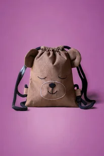 Dziecięcy plecaczek worek wykonany z brązowego nubuku. Ręcznie haftowany pyszczek misia. Bawełniane sznurki w kolorze czarnym. Wyróżnia go bardzo niewielki rozmiar, który idealnie nada się dla dziecka ...