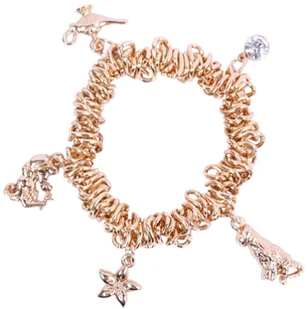 Bransoletka w kolorze złota, na gumce, z zawieszkami. Zawieszki z wizerunkiem Jasminy, małpki Abu, lampy Aladyna, brylantu oraz kwiatu. W komplecie znajduję ...