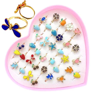 Przepiękny zestaw 36 pierścionków dla dzieci, idealny na każdą okazję! Ten uroczy komplet w kształcie serca zachwyci każdą małą miłośniczkę biżuterii. Każdy pierścionek posiada kolorowy motyw, w tym owoce, kwiaty, motylki, zwierzątka i inne ciekawe wzory, które dodadzą uroku każdej stylizacji.