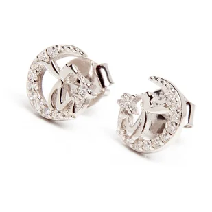 Srebrne kolczyki z cyrkoniami w kształcie księżyca z chłopcem. Wykonane z lśniącego srebra próba 925. Fabrycznie nowe.