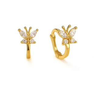 Srebrne kolczyki dziecięce pozłacane motylki z białymi cyrkoniami Lśniące, klasyczne i pełne wdzięku – te pozłacane kolczyki w kształcie motylków to elegancka ozdoba dla każdej dziewczynki. Ich skrzydełka zdobią przejrzyste, błyszczące cyrkonie, które pięknie rozświetlają twarz i nadają biżuterii wyjątkowy, bajkowy charakter. Kolczyki wykonano ze srebra próby 925, pokrytego złotem o ciepłym odcieniu. Delikatna forma i gładkie krawędzie gwarantują komfort noszenia, a solidne zapięcie zatrzaskowe sprawia, że kolczyki są bezpieczne nawet podczas dziecięcych zabaw. To biżuteria, która łączy elegancję z codzienną wygodą.