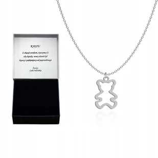 Srebrny naszyjnik MIŚ TABLICZKA GRATIS ⭐Naszyjnik z zawieszką w kształcie misia W całości wykonany ze srebra próby 925. Wszystkie produkty posiadają nabity imiennik i próbę srebra. Naszyjniki i bransoletki posiadają regulację długości w postaci 3cm. Każda zakupiona biżuteria jest zapakowana w ozdobne pudełeczko z logo naszej firmy. Idealnie sprawdzi się jako prezent.