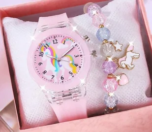 Bamboo Jungle ❤️ Zestaw dla dziewczynki Zegarek i bransoletka z jednorożcem Zegarek: okrągła akrylowa koperta 3,5 x 1,2 cm na silikonowym różowym pasku 23 x ...
