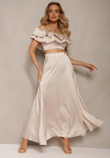 Beżowy Komplet Długa Spódnica Rozkloszowana z Rozcięciem na Boku oraz Bluzka Hiszpanka Virera