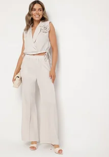 Beżowy Komplet Kopertowa Bluzka z Kwiatową Broszką i Szerokie Spodnie Reavilia
