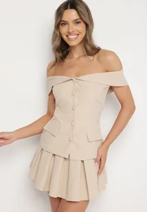 Beżowy Komplet Spódnica i Bluzka Hiszpanka z Guzikami i Imitacją Kieszeni Salendrea