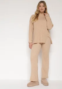 Beżowy Komplet z Bawełną i Wełną Sweter z Guzikami i Proste Spodnie Reisadia