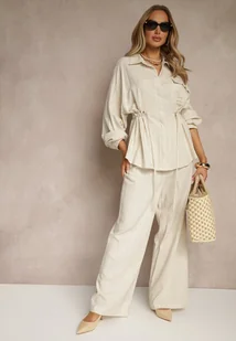 Beżowy Komplet z Wiskozą Koszula Ściągana w Talii i Szerokie Spodnie Divellara