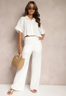 Biały Ażurowy Komplet Krótka Koszula Szerokie Spodnie z Gumką w Talii Rivatma