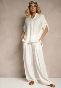 Biały Wiskozowy Komplet Szerokie Spodnie i Koszula z Podpinanymi Rękawami Tulmoi