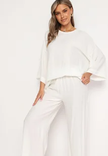 Biały Wiskozowy Komplet Szerokie Spodnie z Gumką w Talii Góra o Kroju Nietoperza Odrina