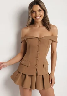 Brązowy Komplet Spódnica i Bluzka Hiszpanka z Guzikami i Imitacją Kieszeni Salendrea