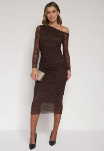 Brązowy Koronkowy Komplet Dopasowana Spódnica i Bluzka na Jedno Ramię Calonara