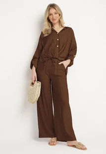 Brązowy Wiskozowy Komplet Oversize Koszula i Spodnie z Gumką w Talii Natilira