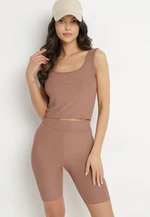 Ciemnobeżowy Prążkowany Komplet Top na Ramiączkach i Szorty Kolarki Mevola
