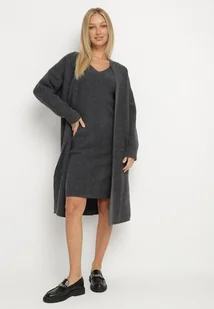 Ciemnoszary Komplet Dzianinowy z Wełną Długi Kardigan i Sukienka w Prążki Falandrea