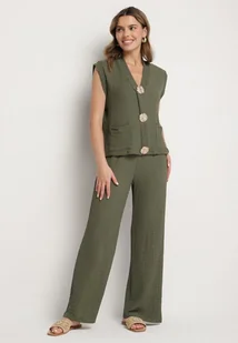 Ciemnozielony Komplet Bluzka Bez Rękawów Zdobiona Broszkami i Szerokie Spodnie Sadaniae