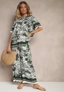 Ciemnozielony Wiskozowy Komplet w Roślinny Wzór Koszula i Spodnie Ridissa