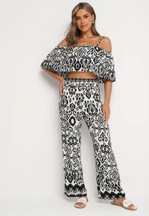 Czarno-Biały Bawełniany Komplet Bluzka na Ramiączkach Spodnie z Gumką w Pasie Charivia