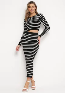 Czarno-Biały Dzianinowy Komplet w Paski Sweter i Ołówkowa Spódnica Midi Alalnine