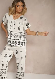 Czarno-Biały Komplet z Bawełny Spodnie o Szerokim Kroju i Koszula ze Wzorem Paisley Pavenn