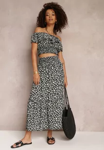 Czarny 2-częściowy Komplet Bawełniany z Topem i Długą Spódnicą w Kwiaty Agnda