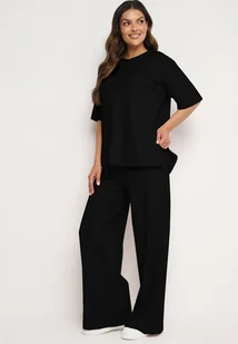 Czarny Bawełniany Komplet Bluzka z Rozcięciami po Bokach Szerokie Spodnie z Gumką w Pasie Undrea