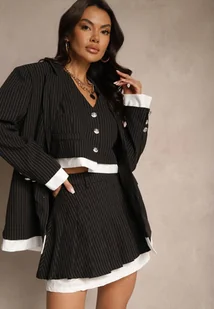 Czarny Elegancki Komplet w Paski z Marynarką Kamizelką i Plisowaną Spódnicą Emmizelle